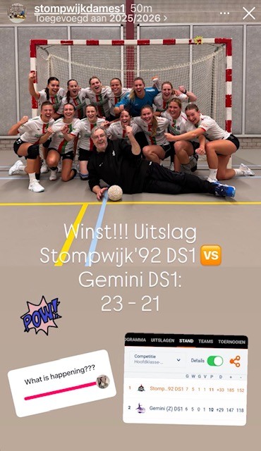 Aan het begin van de 2e helft lieten de Zoetermeerse dames zien dat ze over veerkracht beschikken en kwamen puntje-voor-puntje dichterbij. Met goed uitgespeelde aanvallen en een stevige verdediging wist Gemini het verschil te verkleinen en zelfs met 1 doelpuntje voor te komen (14-15). Het publiek ging er nog eens goed voor zitten, want een spannende slotfase leek in de maak. Toch lukte het Gemini niet om de voorsprong vast te houden. Stompwijk'92 bleef rustig spelen en naar de gaatjes in de verdediging zoeken. In de laatste minuten wist Stompwijk'92 weer een gaatje te slaan, waardoor Gemini niet meer terug kon komen. De wedstrijd eindigde uiteindelijk in een 23-21 overwinning voor Stompwijk'92.